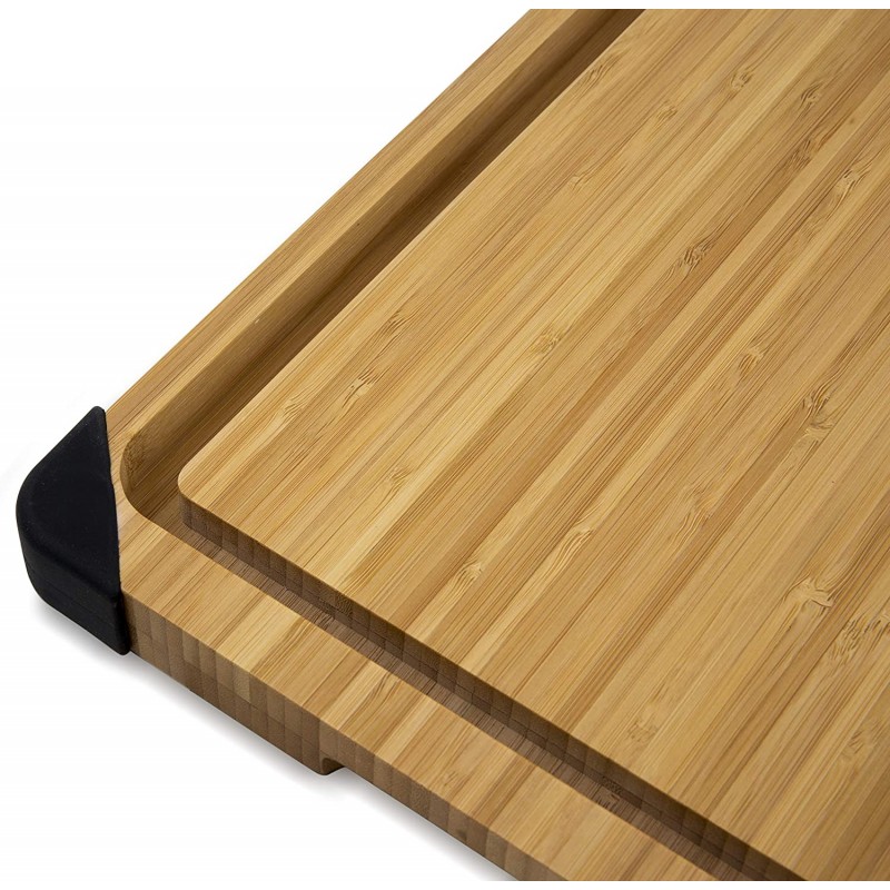 Дві дошки, що входять в комплект, дозволять комфортно нарізати будь-які страви і продукти. Перша дошка – полімерна та використовується для обробки сирого м'яса. Друга – бамбукова, для обробки готових страв. По периметру бамбукової нанесено поглиблення, в якому збирається сік під час нарізки м'яса та овочів, а жолобок дозволить акуратно злити їх. Гумові накладки на кутах не ковзають та фіксують дошку на місці. Використовуючи дошки з комплекту, ви уникнете потрапляння шкідливих мікроорганізмів із сирих продуктів на готові, а також зможете тримати стіл у чистоті, виключивши протікання соку на робочу поверхню.