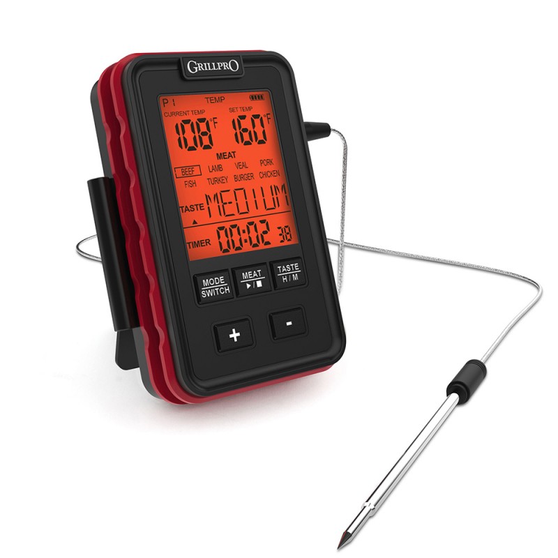 Цифровий термометр Grill Pro забезпечує точний вимір температури всередині страви. Маючи такий термодатчик, можна бачити поточну температуру та готувати їжу строго за рецептом. Дисплей з підсвічуванням відображає задану температуру та поточну температуру приготування. Запрограмований асортименти для різних видів м'яса. Акумулятори не включені. У комплекті один щуп із нержавіючої сталі довжиною 11 см. Елементи живлення в комплектацію не входять.