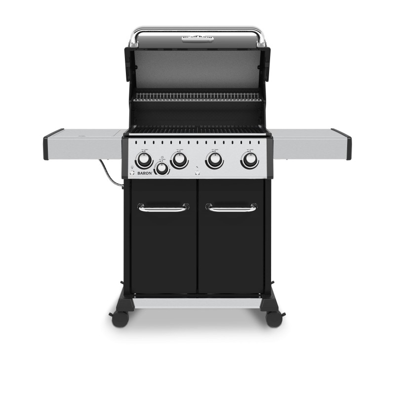 Гриль Broil King Baron 440 газовий чорний (875263) - яскравий представник самої популярної лінійки американської збірки від виробника Broil King. Гриль оснащений однією місткою камерою на 4 пальники; двосторонніми масивними чавунними решітками; закритою шафою з 2-ма дверцятами для зберігання аксесуарів та інструментів; бічними складними столиками з гачками для аксесуарів з боків; бічною конфоркою, що дозволяє готувати та підігрівати соус для Вашого барбекю-шедевра, або зігрійте себе тільки що приготовленим глінтвейном в холодну пору і пориньте в зимові свята. А підсвічування регуляторів не тільки допоможе при процесі в темний час доби, але також стане окрасою вечора.