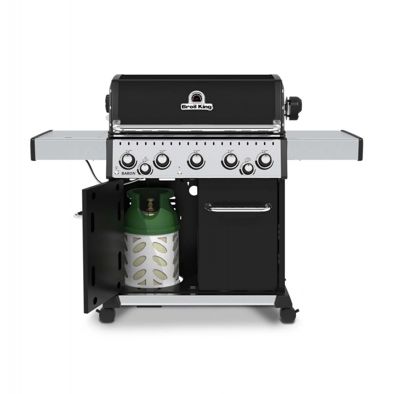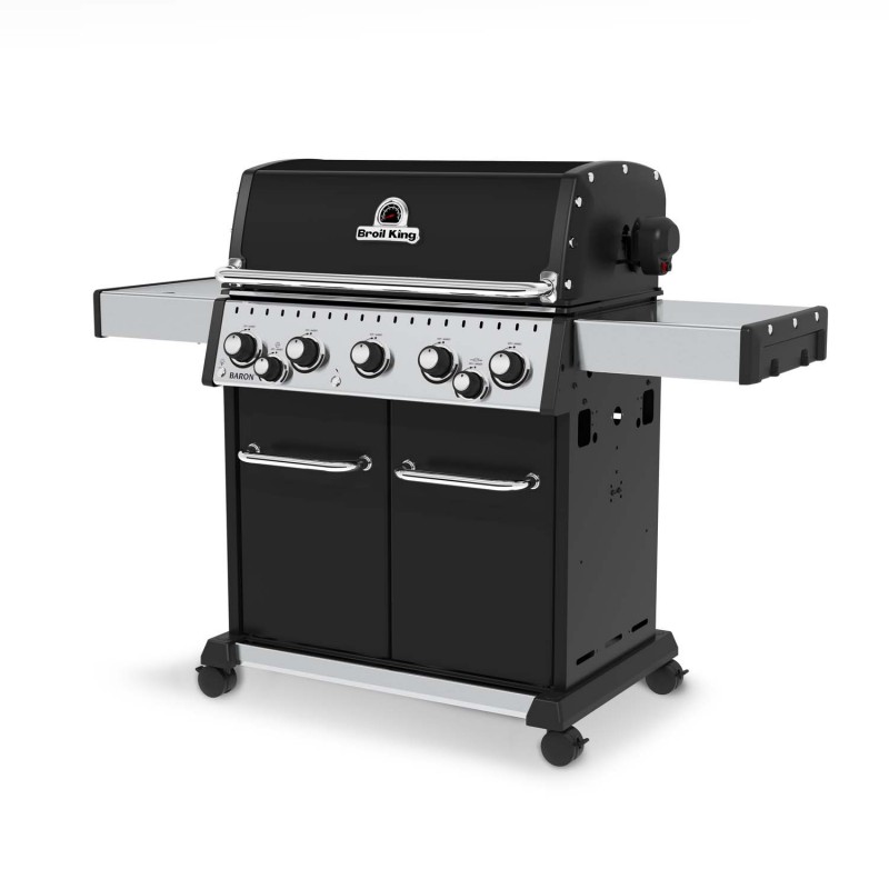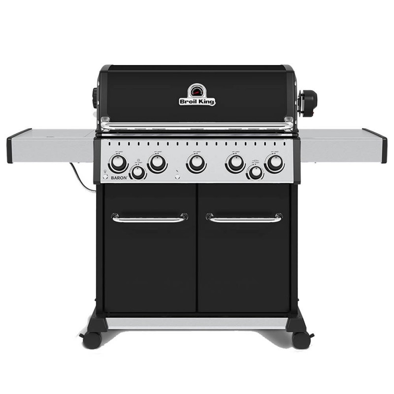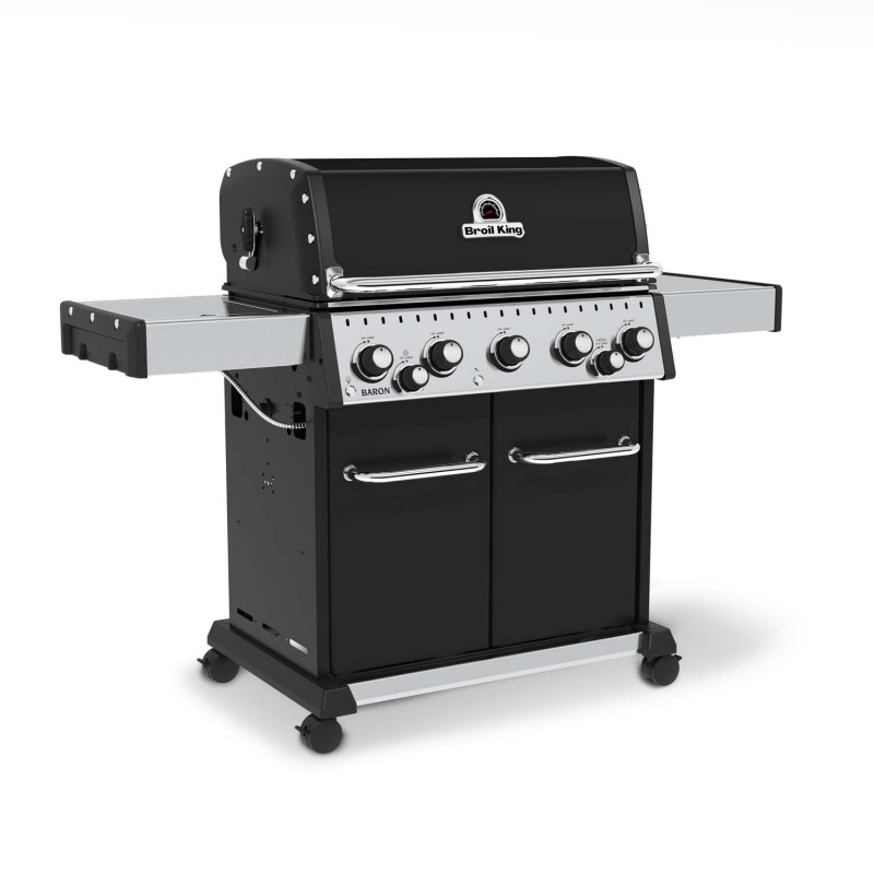 Гриль Broil King Baron 590 газовий чорний (876283) - яскравий представник самої популярної лінійки американської збірки від виробника Broil King. Гриль оснащений однією місткою камерою на 5 пальників; двосторонніми масивними чавунними решітками; роженом на 2 виделки і горизонтальним пальником; закритою шафою з 2-ма дверцятами для зберігання газового балона та інструментів; бічними складними столиками з гачками для аксесуарів з боків; бічною конфоркою, що дозволяє готувати та підігрівати соус для Вашого барбекю-шедевра, або зігрійте себе тільки що приготовленим глінтвейном в холодну пору і пориньте в зимові свята. А підсвічування регуляторів не тільки допоможе при процесі в темний час доби, але також стане окрасою вечора.