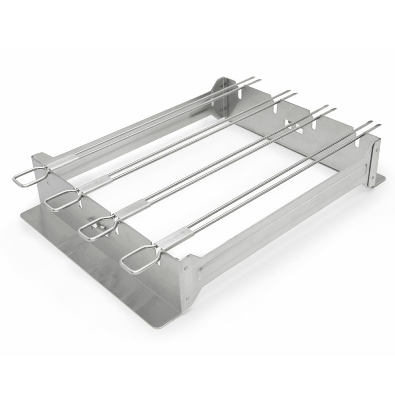 Компактна підставка для шашлику із чотирма шпажками. Кожна шпажка має два зубці і встановлюється у двох положеннях. Матеріал: нержавіюча сталь