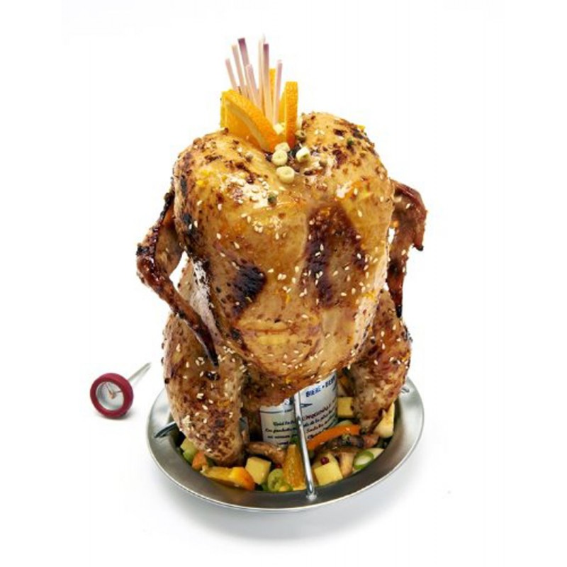 У комплект входить одна підставка з нержавіючої сталі, яка підійде до будь-якої курки, а також вміщає банку пива. Крім підставки, до комплекту входить піддон з нержавіючої сталі з тисненим логотипом Broil King, а також термометр для птиці з силіконовою фаскою. З цією підставкою ваша курка прожариться рівномірно і з хрусткою скоринкою з усіх боків.