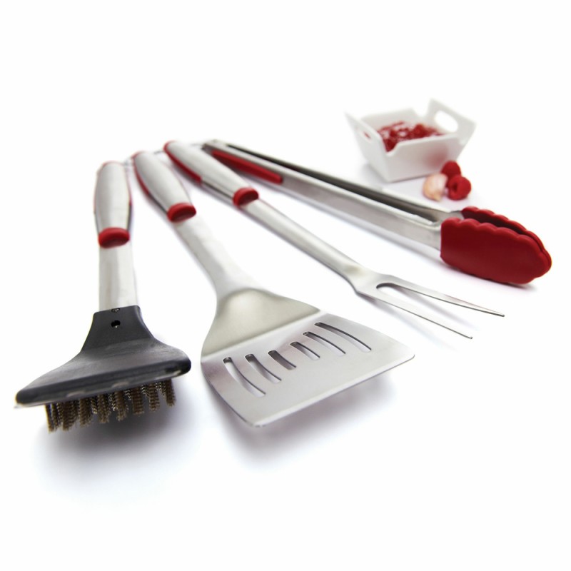 Набор инструментов для барбекю изготовлен из нержавеющей стали с силиконовыми накладками, что защищают руки от ожогов. Это минимальный необходимый набор для старта приготовления. В наборе для барбекю: лопатка, вилка для мяса, щетка для чистки гриля и щипцы. Щипцы с силиконовыми накладками помогут крепко захватить продукт и он не будет соскальзывать. Длина аксессуаров: 42 см