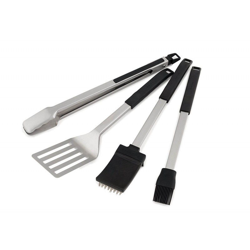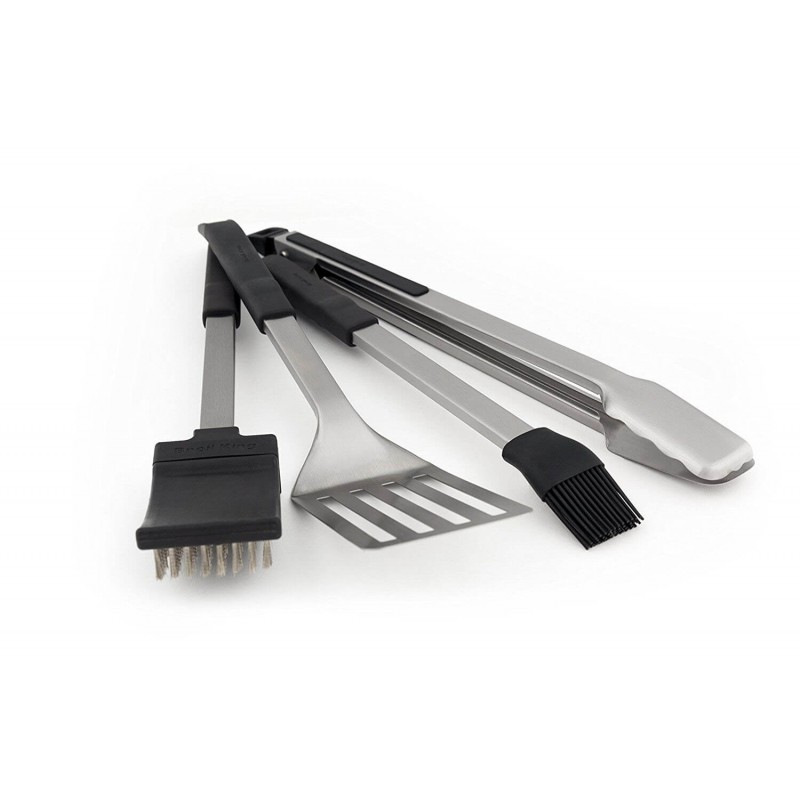 Профессиональный набор инструментов для гриля включает в себя универсальные щипцы для гриля, широкую лопатку, силиконовую кисточку для смазывания и грубую металлическую щётку для чистки решёток. Все инструменты изготовлены из высококачественной нержавеющей стали и оснащены защитными эргономичными ручками из мягкого термостойкого силикона. Отлично гармонируют с грилями Broil King серии Baron.