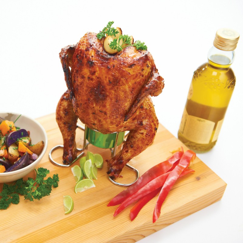 Стойка для курицы изготовлена из прочной нержавеющей стали. Подходит для приготовления в вертикальном положении на банке.