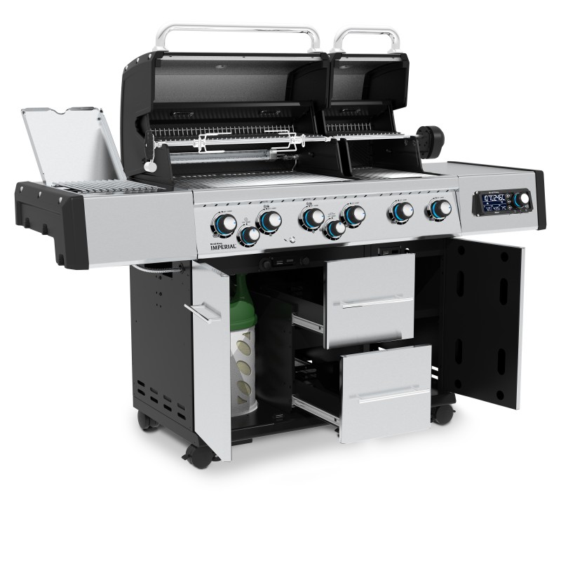 Интеллектуальный контроллер iQue™ предлагает различные предварительные настройки, а также индивидуальные настройки для приготовления ребрышек, курицы, печени, свинины или стейков, например, и контролирует температуру гриля независимо и полностью автоматически. Для хранения баллона, инструментов и продуктов предусмотрено 2 выдвижных ящика и 2 шкафа с дверцей. Из электроники предусмотрено: 3 лампочки для подсветки камер гриля с внутренней стороны, подсветка регуляторов и электроподжиг горелок. Также имеет 6 колесиков с стопами из прочного пластика в высоту 7,6 см и 3 ножки для регулировки высоты с передней стороны гриля.