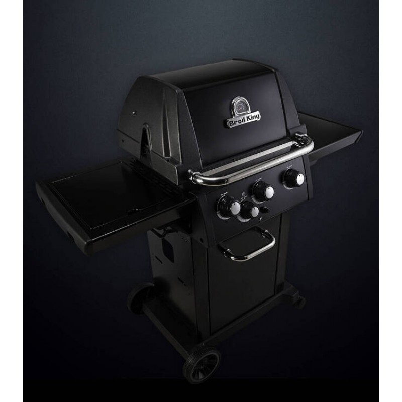 Гриль Broil King Royal 340 газовый имеет камеру с общей рабочей площадью в 3 500 см² на 2 двусторонние решетки Flaw-R-Cast™ из чугуна, решетку для подогрева из нержавеющей стали, 3 основные горелки из нержавеющей стали. 3 аромапластина Flaw-R-Wave™ и стальную боковую конфорку. Гриль оснащен крышкой из лицевой пластины из нержавеющей стали и топкой из литого алюминия, что обеспечивает минимальную тепловую потерю в камере гриля, за счет материала камеры и минимального количества и размеров отверстий. Для хранения баллона, инструментов и продуктов предусмотрен шкаф с 1 дверцей. Из электроники предусмотрен электроподжиг горелок. Также имеет 2 больших колеса в высоту 18 см и 2 маленьких колесика со стопами в высоту 6,4 см.
